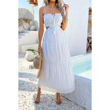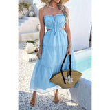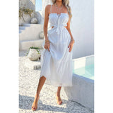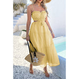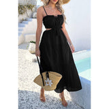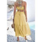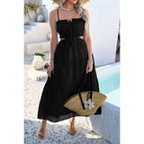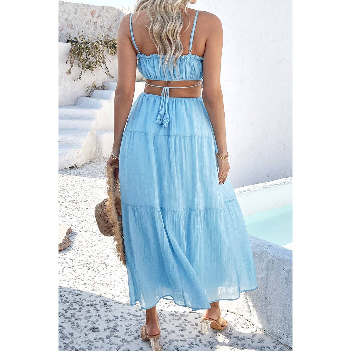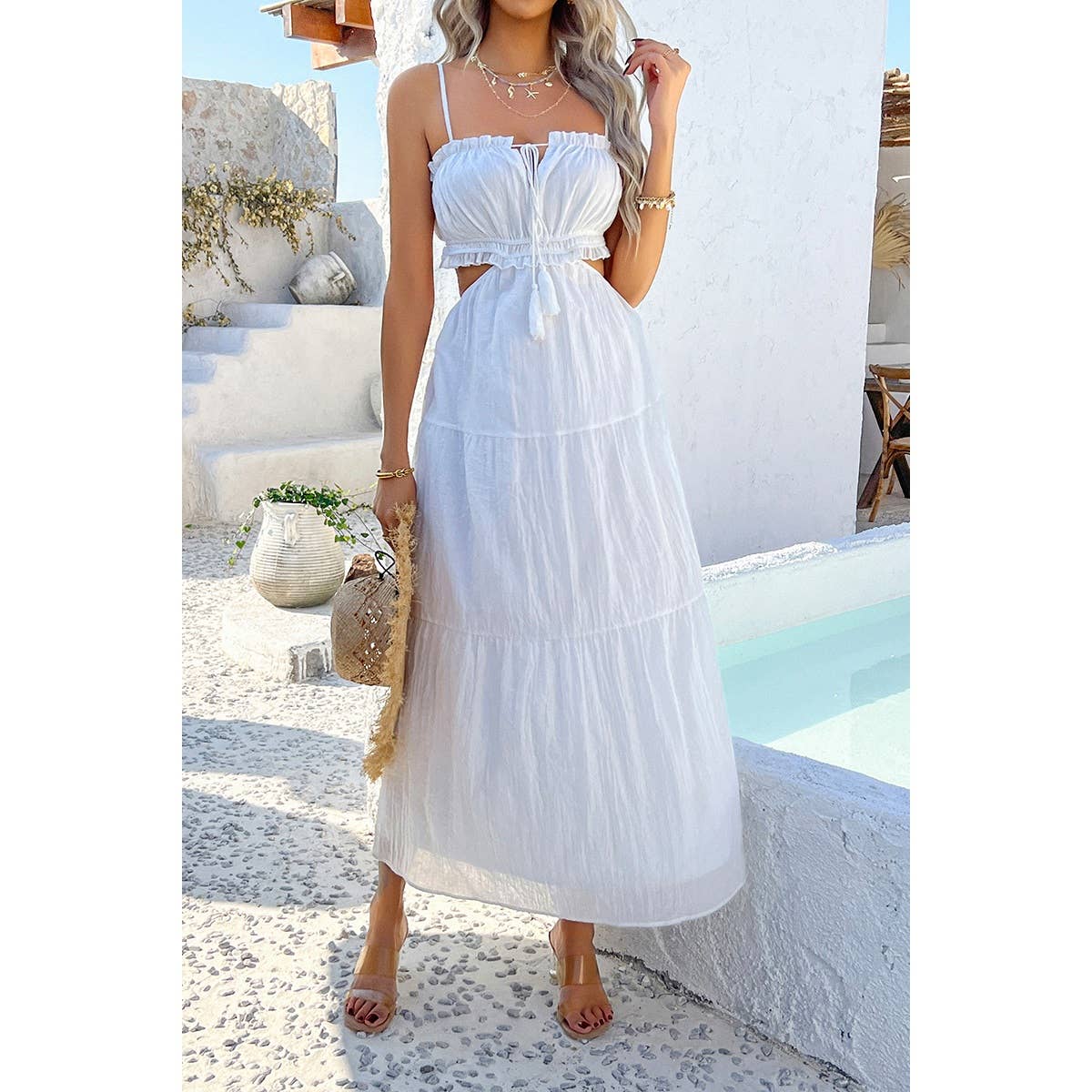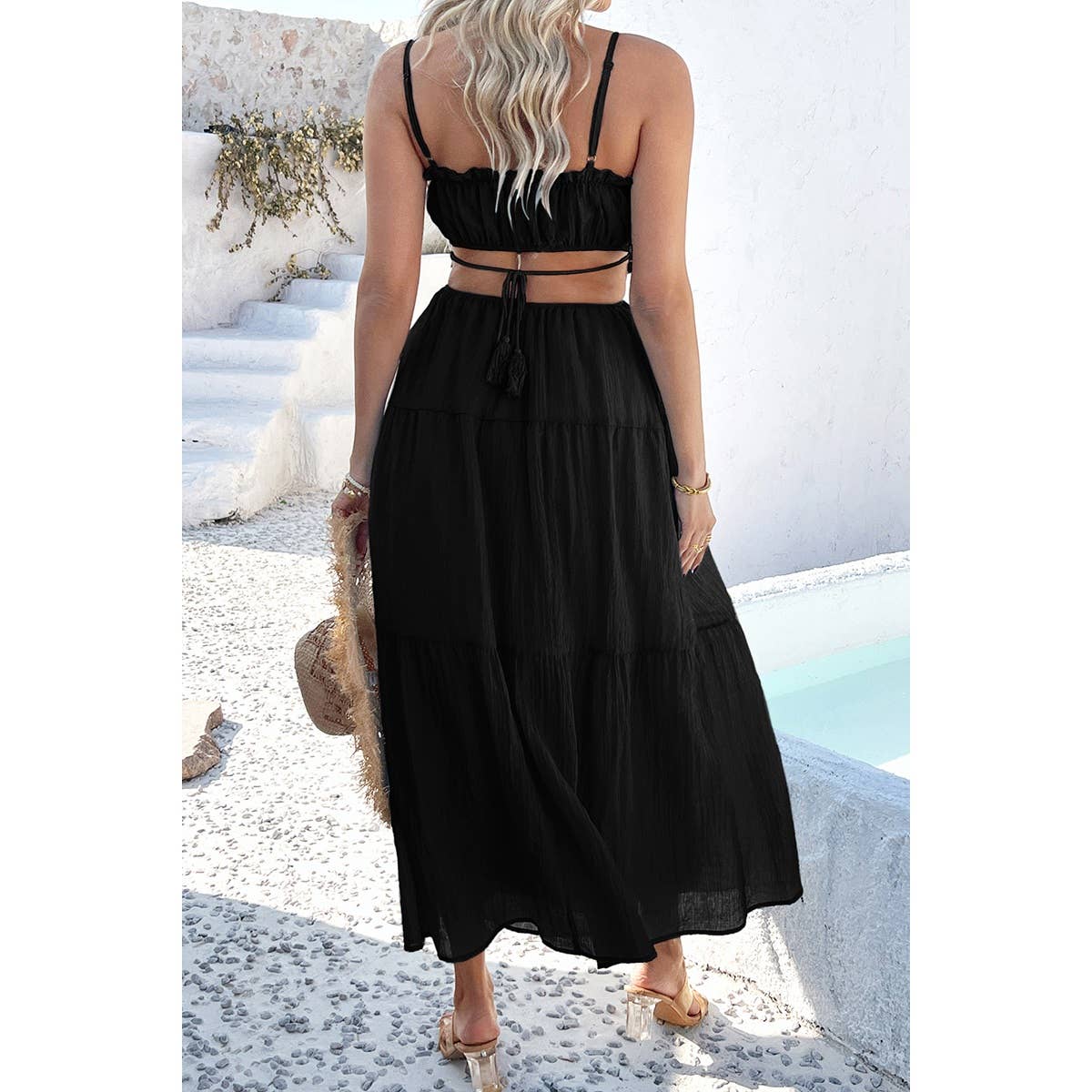 Features: Solid Cut Out Ruched Spaghetti Strap Tiered Dress