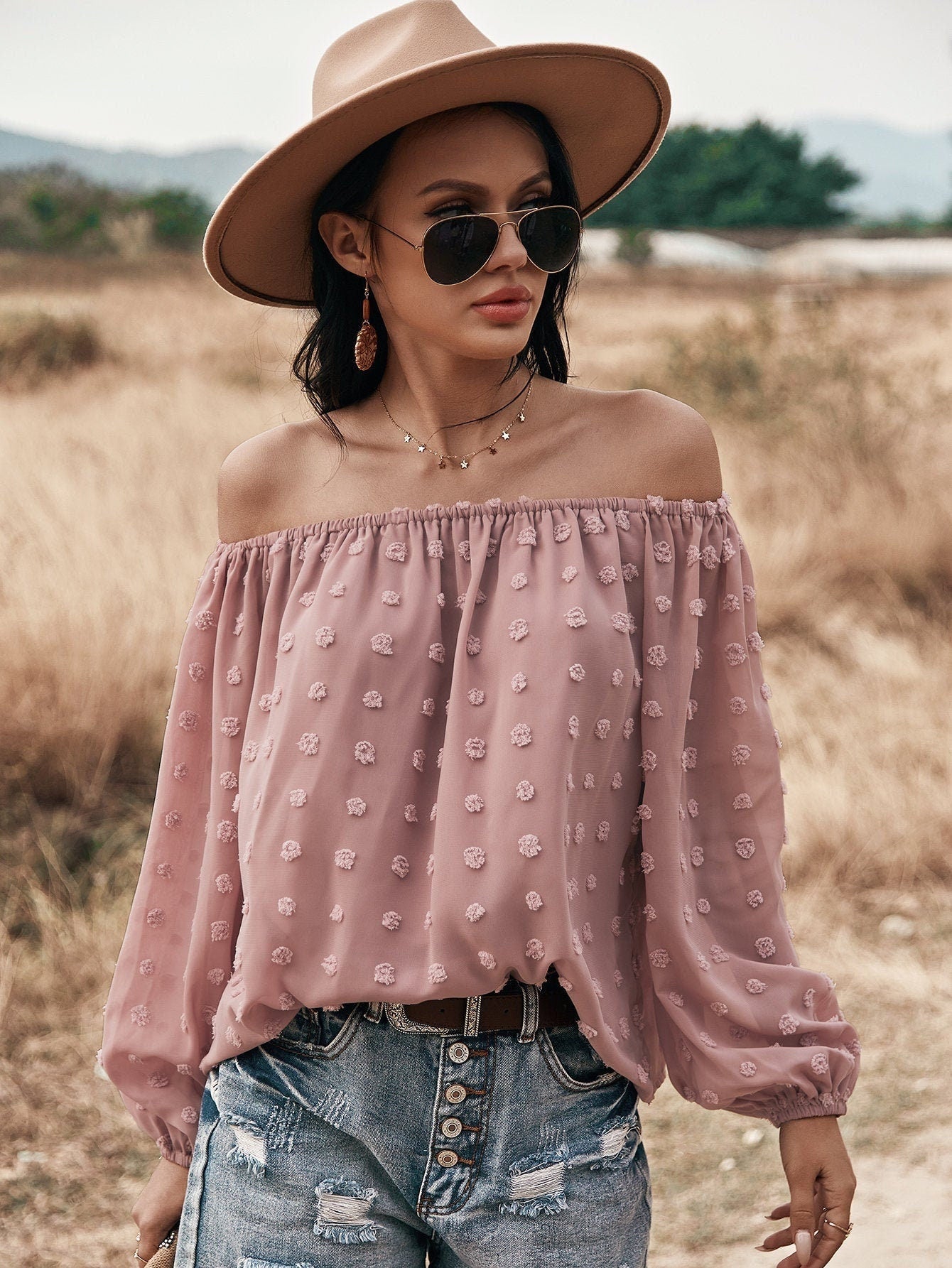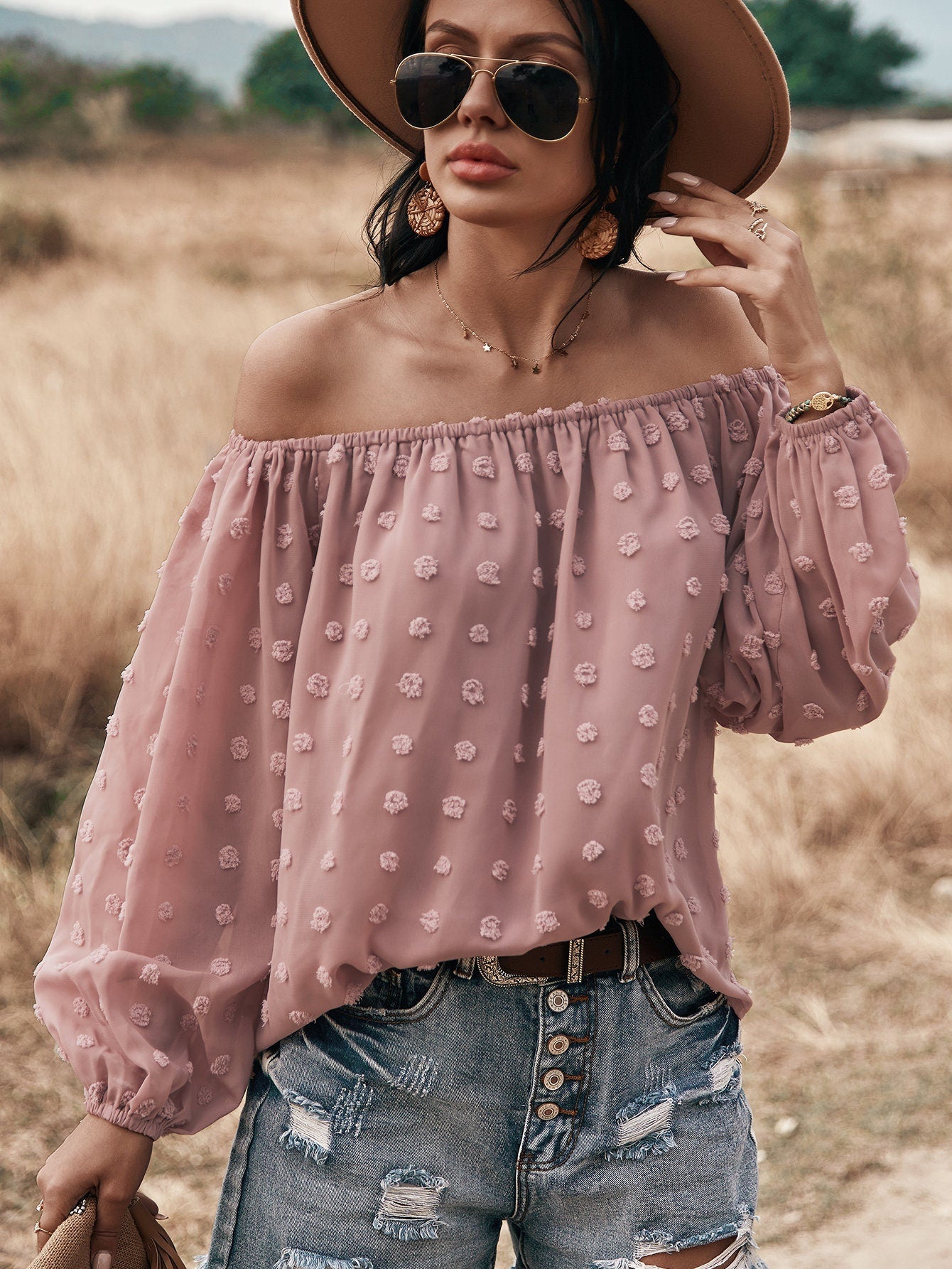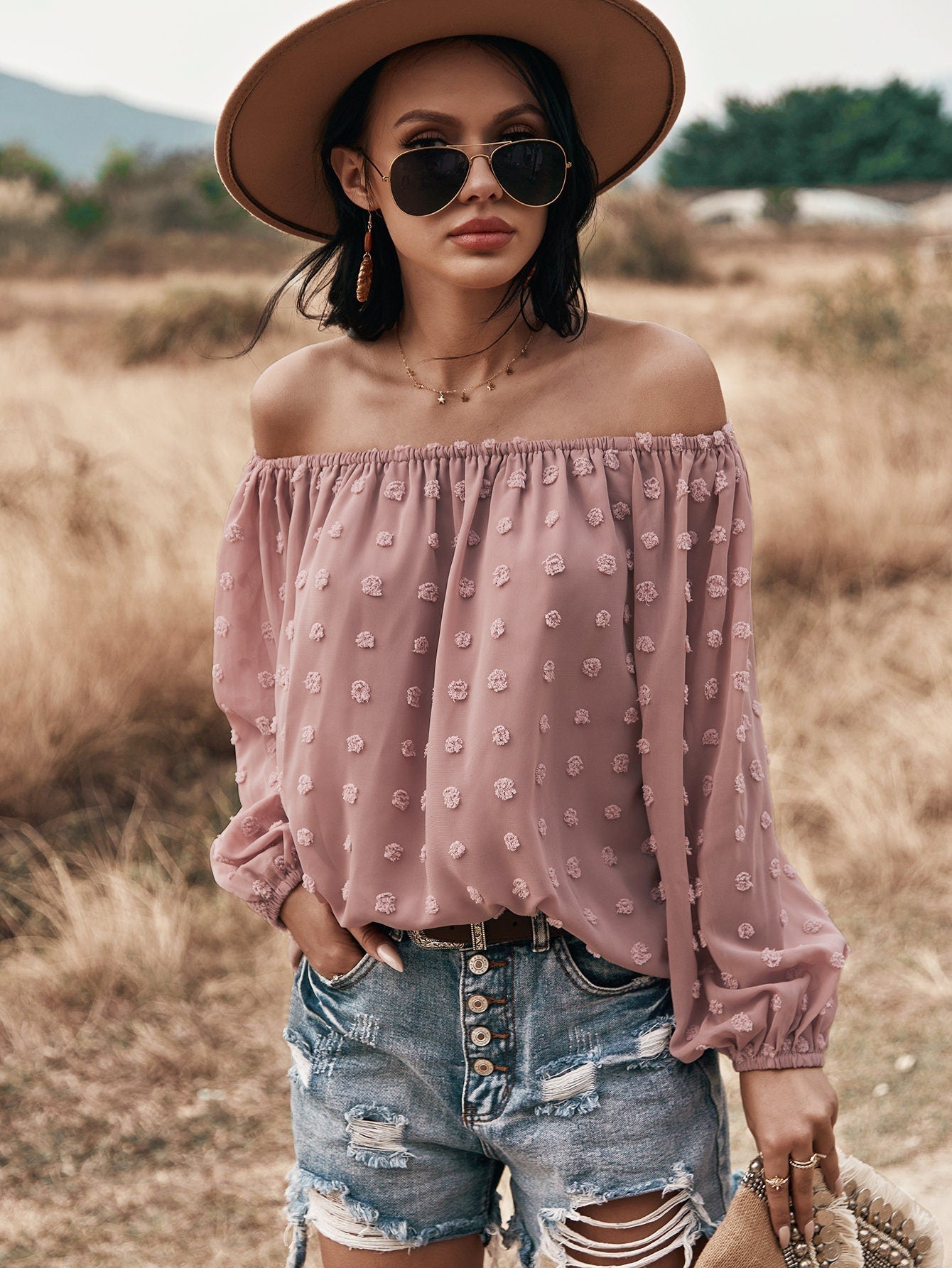 Features: Off Shoulder Swiss Dot Long Sleeve Loose Top